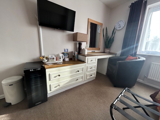 TV, mini fridge, hairdryer, tea & coffee making facilities. A variety of teas, coffee, hot chocolate and fresh milk are provided.