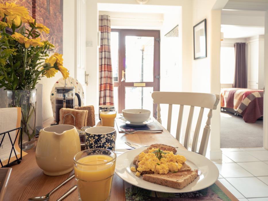 Breakfast consists of a selection of cereals, white or brown toast with butter and jam/marmalade, orange juice and a pot of tea and/or a cafetiere of coffee. We can also provide a cooked breakfast in the form of eggs from our own free range chickens. Scrambled or fried on toast, or boiled with soldiers perhaps?
